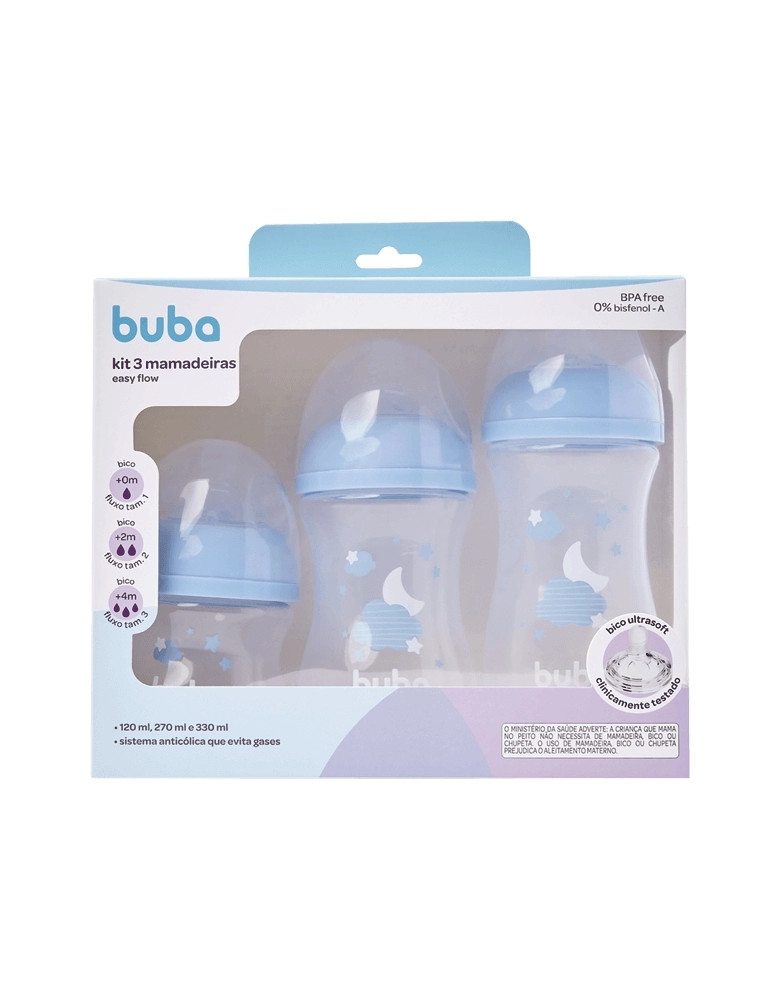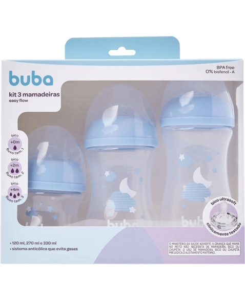 ACESSORIOS>INFANTIL>MAMADEIRA>BUBA KIT 3 MAMADEIRAS EASY FLOW NUVEM AZUL 120/270/330ML