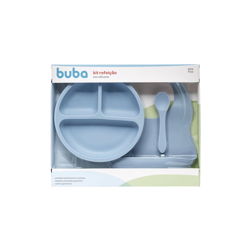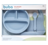 ACESSORIOS>INFANTIL>TALHER>BUBA KIT REFEICAO SILICONE AZUL (BABADOR,COLHER,PRATO DIVISORIA E VENTOSA)
